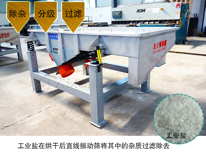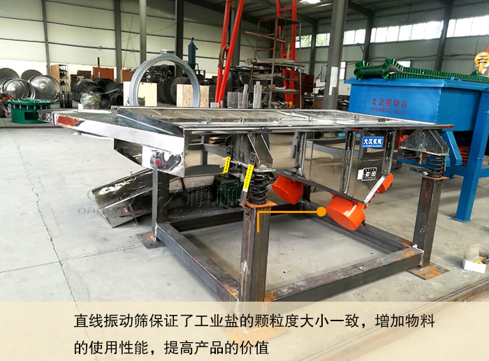 工業鹽在生產包裝發貨前可能會混有雜質,所以需要使用振動篩先將其篩分過濾掉,才能進入下一步的包裝機中,在工業鹽生產線上通常需要有兩道振動篩來對物料的品質進行把控,所以大漢根據多年篩選經驗推薦您使用直線振動篩來篩分工業鹽。