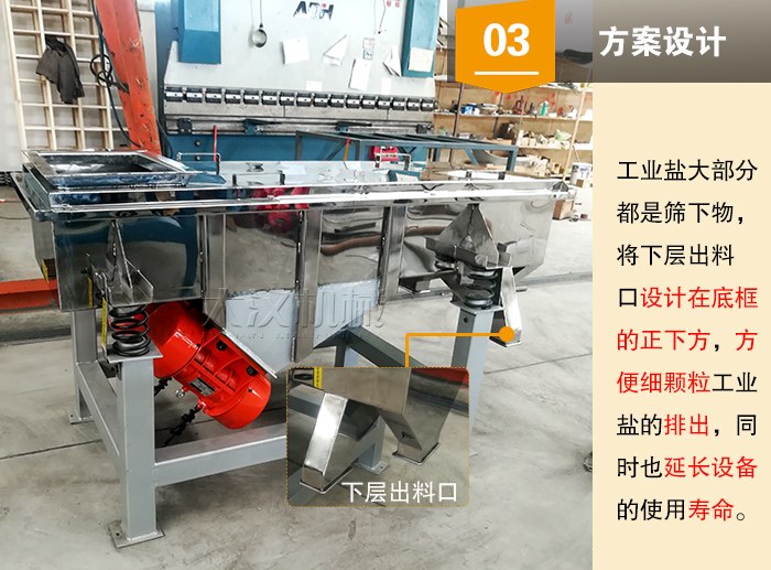 【方案設計】——工業鹽大部分都是篩下物,因此要對直線振動篩的下出料口進行改造,將下層出料口設計在底框的正下方,方便細顆粒工業鹽的排出,同時也延長設備的使用壽命。