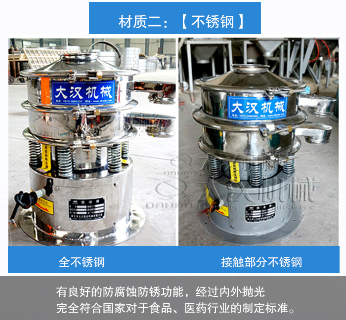 不銹鋼振動篩的結(jié)構(gòu)主要是【1.全不銹鋼;2.不銹鋼+碳鋼(與物料接觸部分為不銹鋼)】接觸物料為不銹鋼材質(zhì)的振動篩主要是物料對接觸的設(shè)備材質(zhì)有所要求,防止物料與碳鋼接觸對物料進行污染;全不銹鋼振動篩是主要針對食品、醫(yī)藥等行業(yè),其使用環(huán)境要求嚴(yán)格,容易對設(shè)備進行清理。具有良好的防腐蝕防銹功能,經(jīng)過內(nèi)外拋光后的304不銹鋼表面光滑無毛刺現(xiàn)象,完全符合國家對于食品、醫(yī)藥行業(yè)的制定標(biāo)準(zhǔn)。