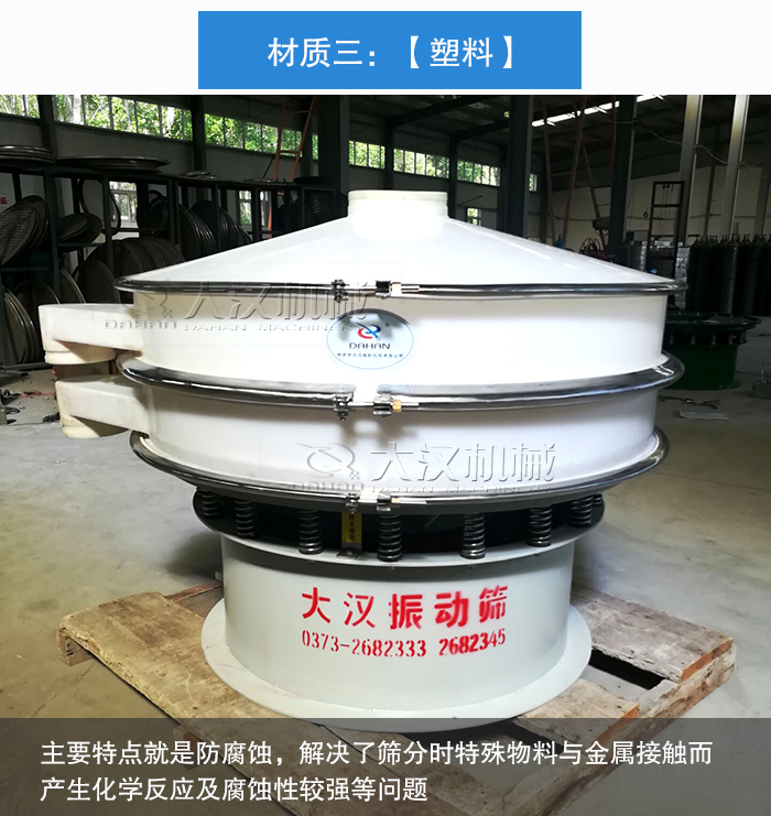 塑料振動篩的結(jié)構(gòu)主要是【塑料+碳鋼(與物料接觸部分為塑料)】它主要特點就是防腐蝕,解決了篩分時特殊物料與金屬接觸而產(chǎn)生化學(xué)反應(yīng)及腐蝕性較強等問題。接觸物料部位從篩框、篩網(wǎng)、中框、密封蓋和清網(wǎng)裝置等完全采用非金屬材料,完全排除了一些特殊物料與金屬接觸會產(chǎn)生化學(xué)反應(yīng)等問題。塑料振動篩適用于化工、醫(yī)藥、軍工等特種行業(yè)干粉或漿液類物料篩分過濾作業(yè)。