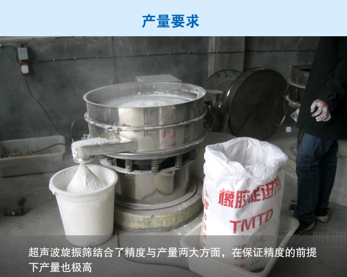 解決方法:超聲波旋振篩具有體積小、結構簡單合理、篩分精度高、維修方便、保養簡單、篩網壽命長等優點。可單層或多層使用,可達到五層,對物料的篩分精度可達500目或0.028mm,可根據物料性能選配適宜的篩孔,從而解決了木粉篩分精度問題。