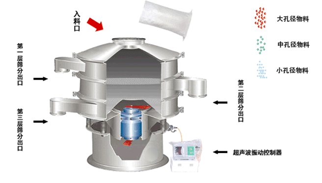 超聲波振動篩是在傳統的普通振動篩基礎上在篩網上加裝了一個超聲波系統,超聲波將高頻電能轉化轉變成超高頻機械振動。物料在篩網上隨機械振動做三次元運動,同時受到超聲波振動波影響,又持續做高頻率、低振幅運動,篩分的物料接受巨大的超聲加速度,使篩面上的物料始終保持懸浮、騰空狀態,防止它們堵塞網孔,抑制篩分物料在篩分過程中的粘附、摩擦、平降、楔入等現象,真正解決了物料強吸附性、易團聚、易粘黏、高精細、高密度、輕比重等篩分難題,進而達到高效篩分、高產量的目的。